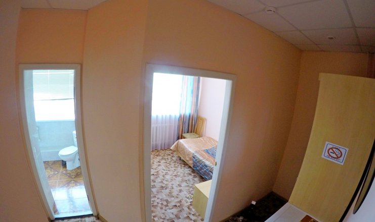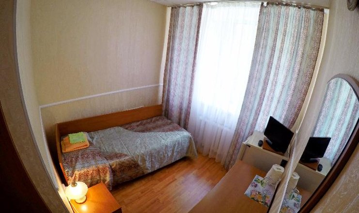 В номере: стол, 1 стул, встроенный шкаф-купе, телевизор, холодильник, электрочайник, фен, односпальная кровать.
